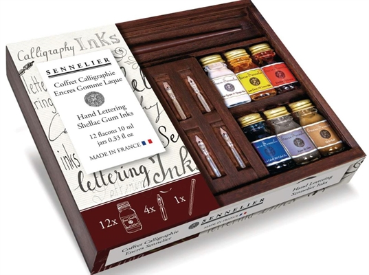 Sennelier - Cofanetto in Legno Inchiostri Calligrafici Alla Gomma Lacca - 12 Inchiostri da 10 Ml, 4 Pennini e Un Cannello in Legno - Art. N134025.00
