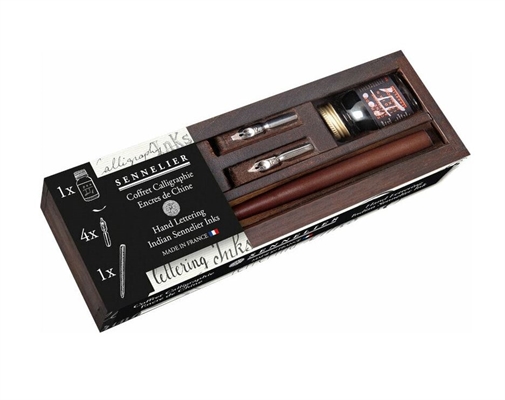 Sennelier - Cofanetto in Legno "la Pagode" per Calligrafia - 1 Inchiostro Nero da 10 Ml, 4 Pennini e Un Cannello in Legno - Art. N134024.00